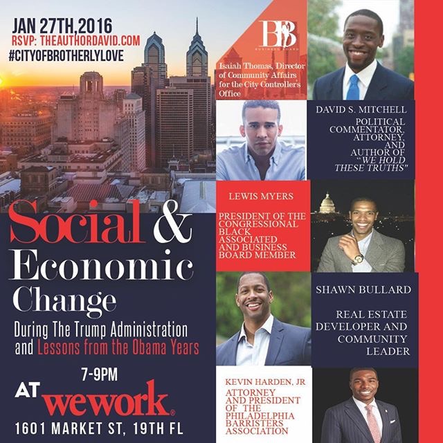 RSVP HERE!!! David S. Mitchell, author of the recently released novel, We Hold These Truths, will appear on an esteemed panel of political thought influencers and community leaders for a discussion addressing social and economic change during the upcoming Trump administration—and critical lessons from the Obama years. Mitchell will also explain why We Hold These Truths constitutes an important and timely articulation of how inaction by … Continue reading RSVP for Philly Panel Discussion on Friday, January 27th, 2017: “Moving Forward Intelligently under President Trump”